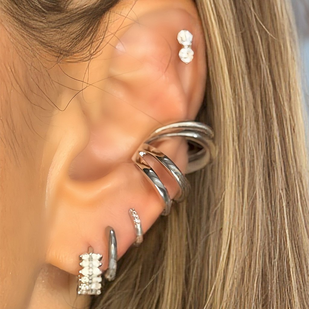 Quer um visual cheio de estilo sem precisar de perfuração? Esse ear cuff fake é a escolha perfeita! Com design moderno de várias argolas lisas unidas, ele traz um efeito estiloso e impactante na orelha com total conforto.
