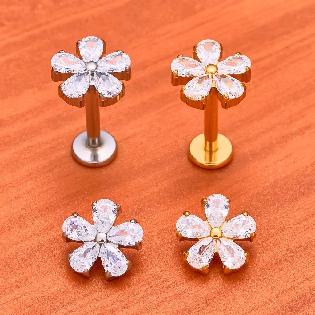 Piercing labret em aço cirúrgico com formato de flor, composto por seis zircônias lapidadas em gota, garantindo brilho intenso e um visual delicado. Disponível em prata e dourado, com acabamento premium e base labret para maior conforto e firmeza.
