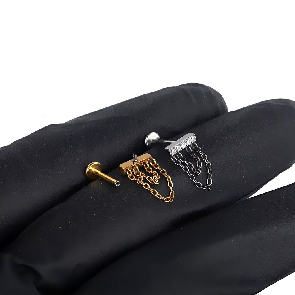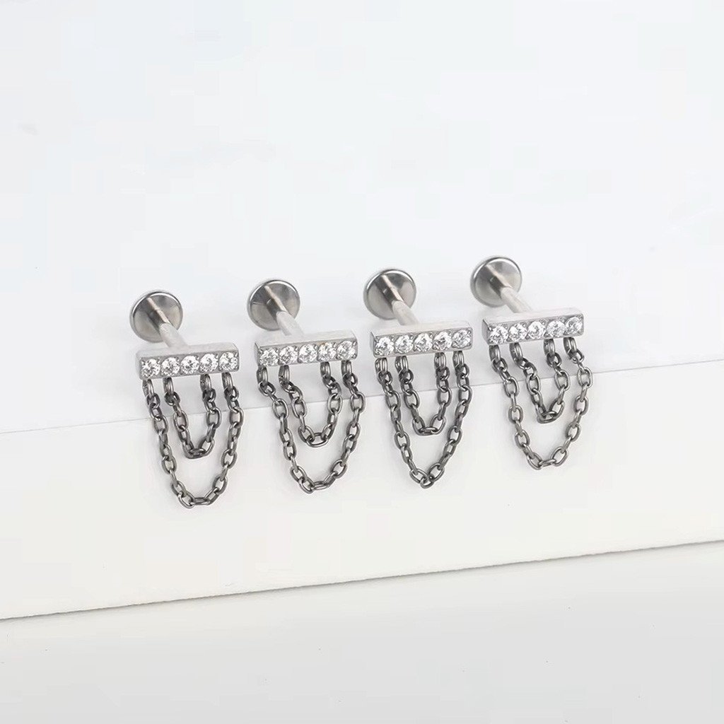 Piercing labret com barra de zircônias e correntes duplas, perfeito para quem busca um visual moderno e elegante.