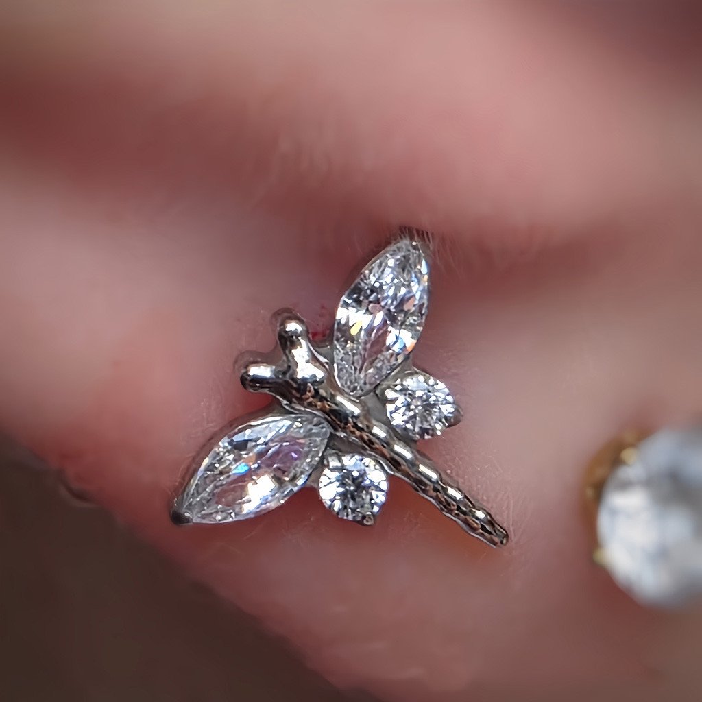 O modelo apresenta libélula detalhada com zircônias cravejadas, criando um brilho elegante e um visual delicado que valoriza a orelha com sutileza. Ideal para composições modernas em tragus, helix, conch ou lóbulo.